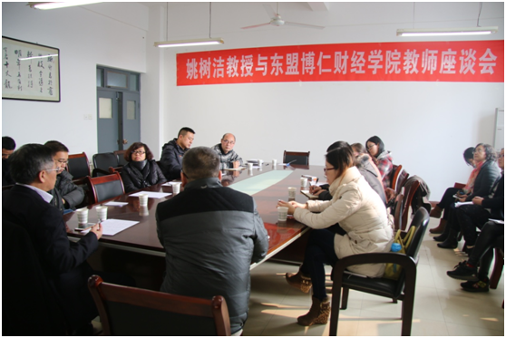 2016年12月13日上午,英国诺丁汉大学经济学教授、陕西省“百人计划”入选者、best365官方网站“渭华学者”姚树洁教授与东盟博仁财经公司青年教师进行座谈,魏源博士、屈晓娟博士及公司三十多名青年教师参加了座谈。
