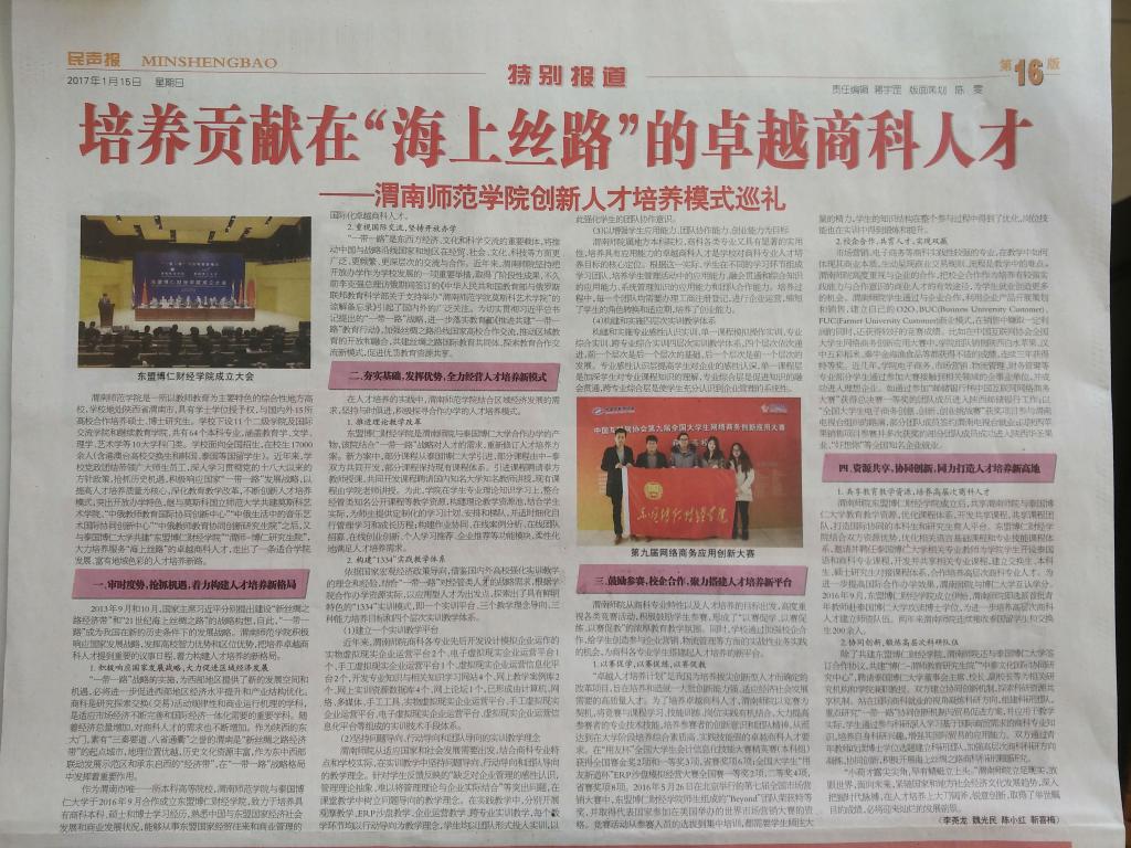 2017年1月15日,由陕西省人大常委会主办的《民生报》第1125期第16版全文刊发了公司《培养贡献在“海上丝路”的卓越商科人才——best365官方网站创新人才培养模式巡礼》文章。