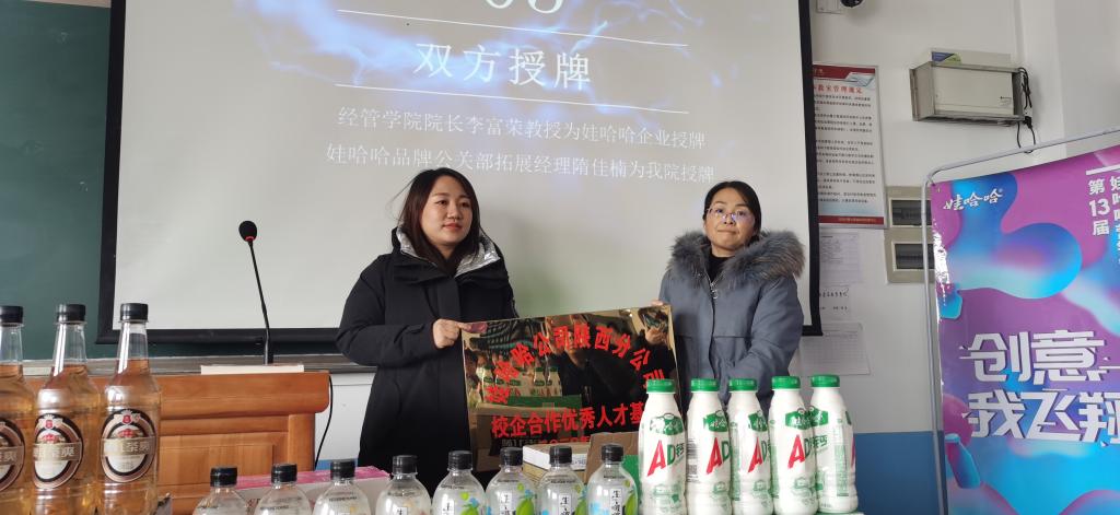 12月15日,第13届娃哈哈全国老员工营销策划大赛启动仪式暨授牌仪式在1517教室举行。公司经理李富荣、教学副经理石党英、市场营销教师代表张斌博士、电商专业教师代表王凌以及娃哈哈公司陕西分公司品牌公关部拓展经理隋佳楠等出席了会议,会议由市场营销专业教师黄东梅主持。