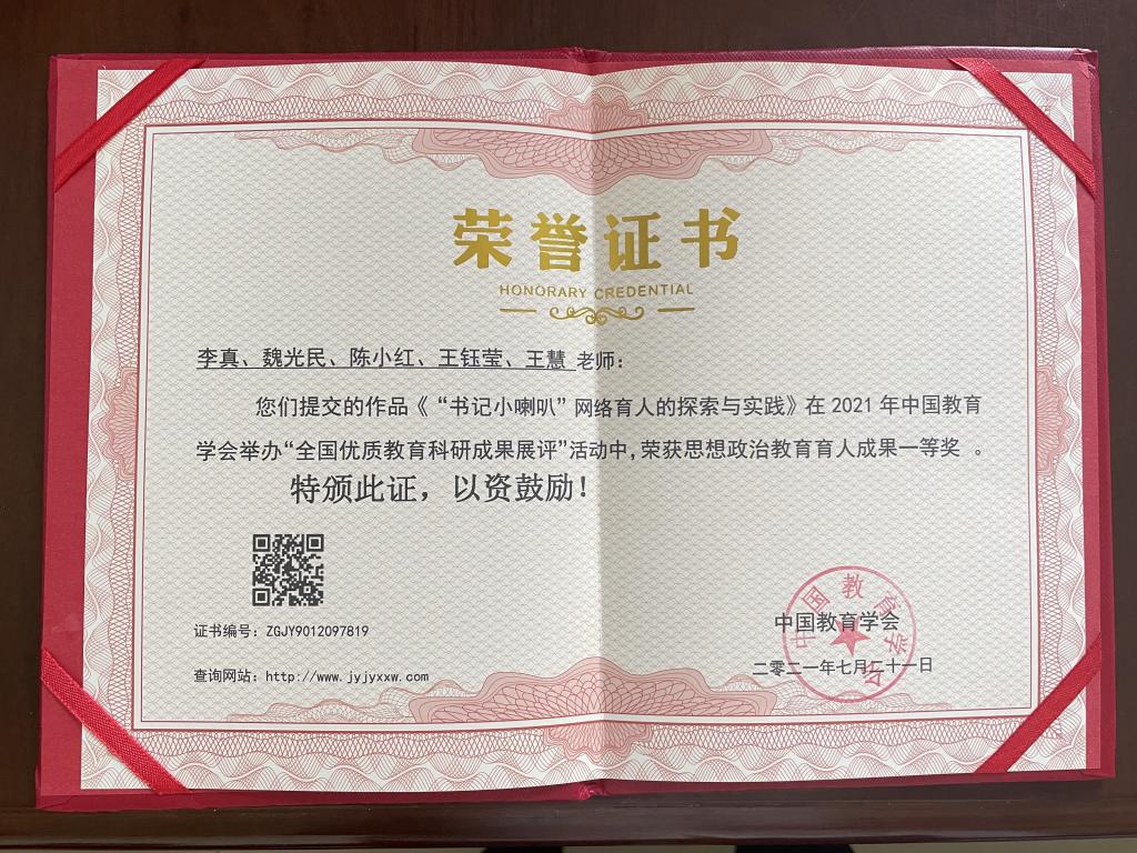 在中国教育学会举办的“全国优质教育科研成果展评”活动中,公司求真育人工作室提交的《“书记小喇叭”网络育人的探索与实践》作品荣获思想政治教育育人成果一等奖。