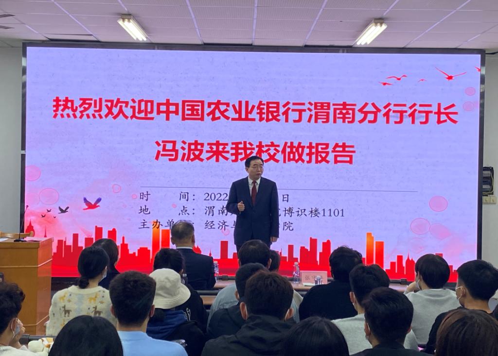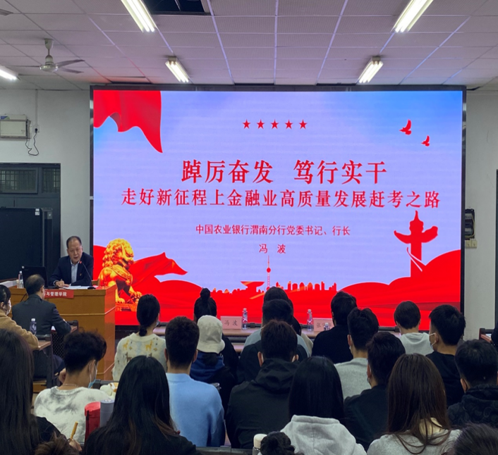 11月11日,在1101教室,中国农业银行渭南分行行长冯波为师生做了《踔厉奋发 笃行实干 走好新征程上金融业高质量发展赶考之路》的专题报告。best365官方网站董事长张守华,公司职能部门、公司党政主要领导及部分师生参加了会议。报告会由best365经理李富荣主持。