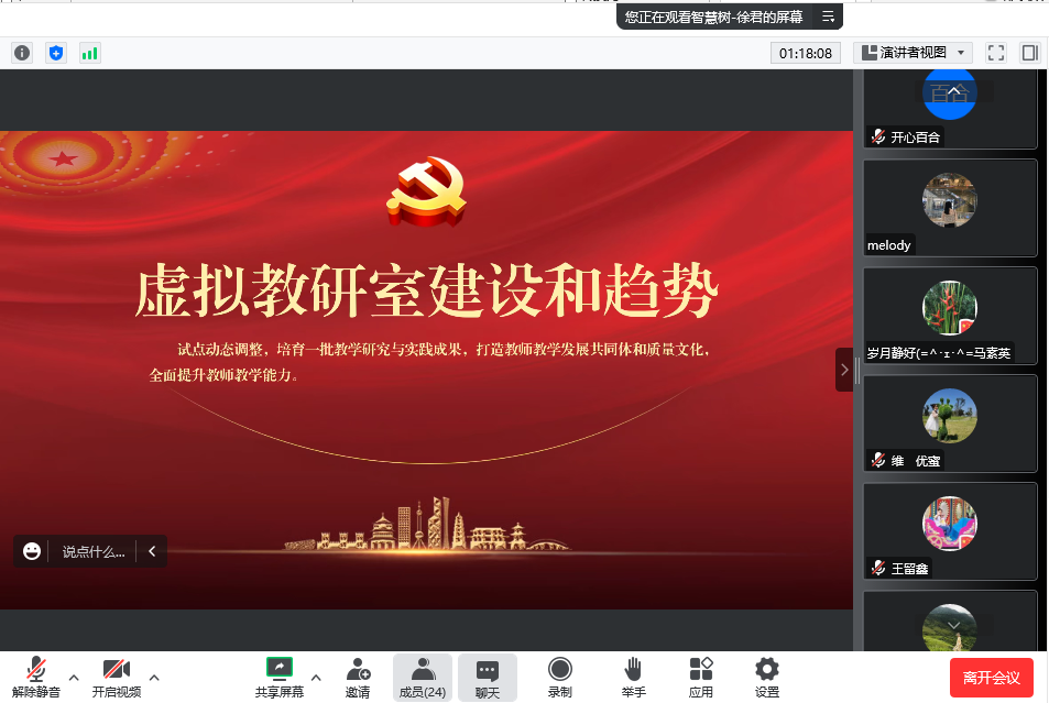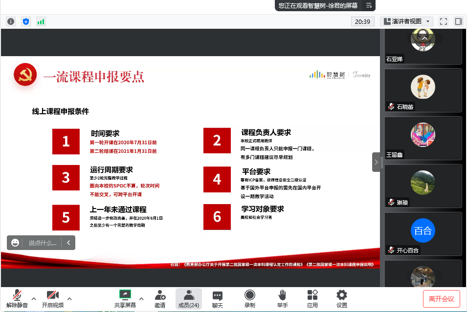 徐君老师以二十大的指导思想为依据,讲解了我国一流课程建设的时代背景和过程,以及一流课程申报注意要点、虚拟教研室的建设和趋势,分享了申报过程中的一些经验。报告会针对性和指导性强,受到了各位老师的好评。