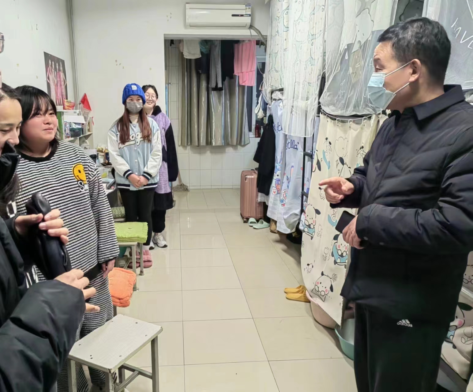 走访中,肖耀刚与同学们亲切交流,详细了解同学们的学习、生活情况以及思想动态,仔细叮嘱同学们要注意用电安全和防寒保暖,特别是外出要做好个人防护,带好口罩,做自己健康的“第一责任人”。最后肖耀刚勉励同学们要积极主动学习,认真上好每一门网课,掌握扎实的专业知识,为今后走向社会打下坚实基础。