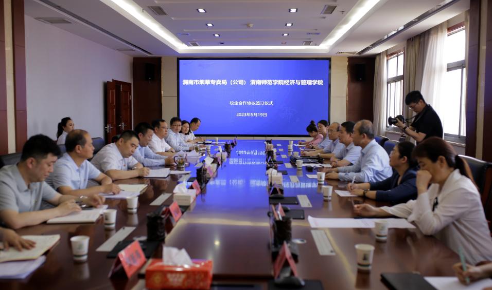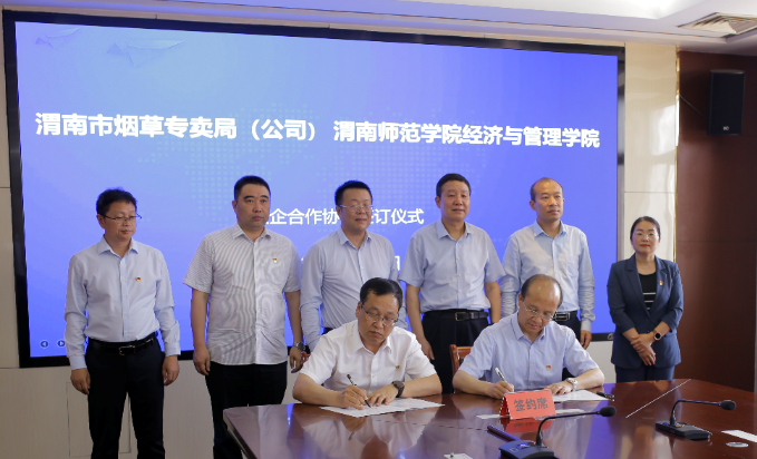 5月19日下午,best365正规与渭南市烟草专卖局(公司)在烟草专卖局(公司)举行了校企合作协议签约仪式。渭南市烟草专卖局(公司)副经理贺会彬主持签约仪式,渭南师范公司党委副书记、纪委书记、监察专员肖耀刚出席并讲话,教务处处长孙宏恩、best365经理李富荣、副经理石党英、学工办副主任朱玉娜、经济学和会计学专业建设负责人及办公室人员参加会议。