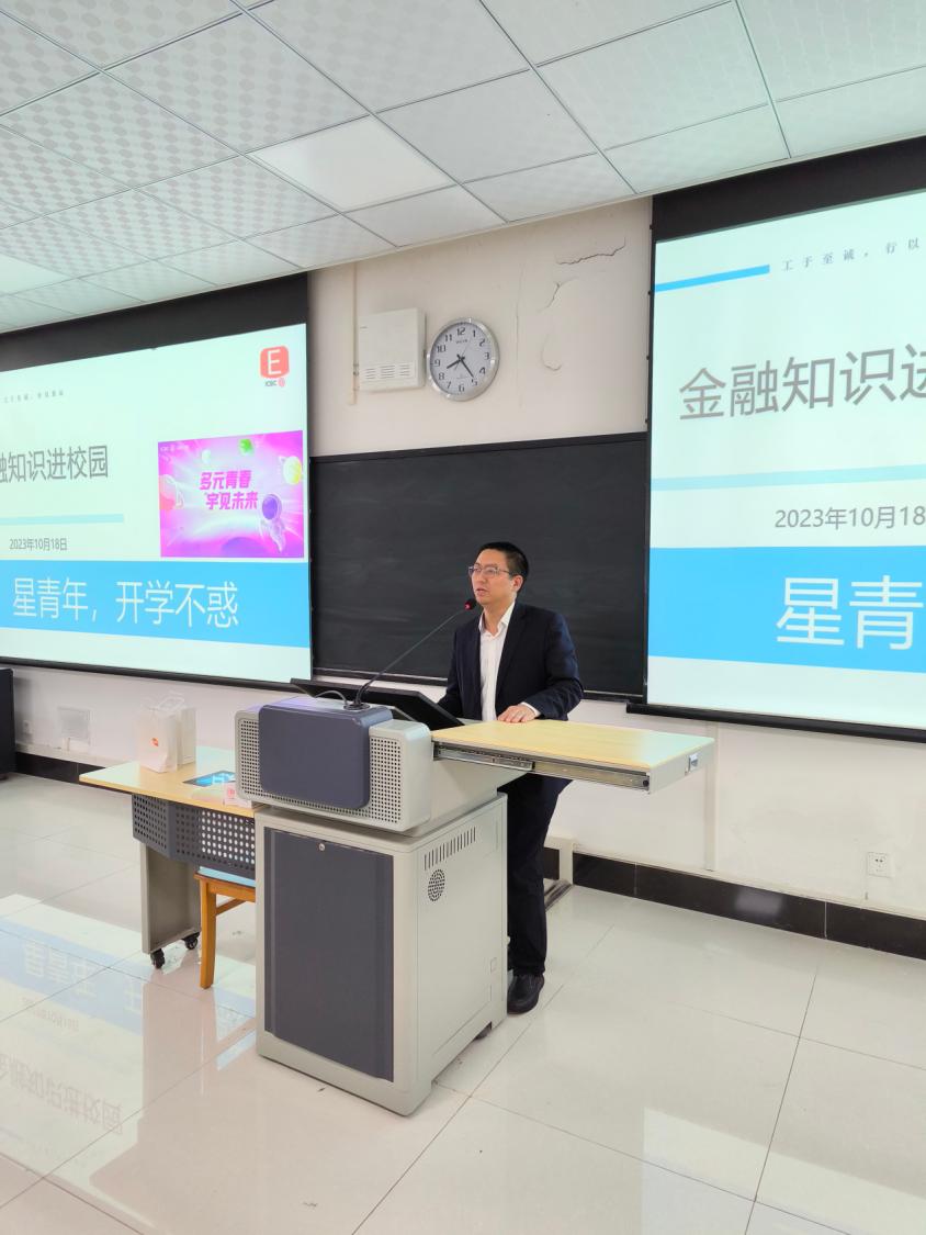 黄震龙为同学们开展金融知识进校园宣讲活动,用真实诈骗案例为员工们进行反诈骗宣传,同时,将金融知识与诈骗案例相结合,增强了员工的反诈骗意识。