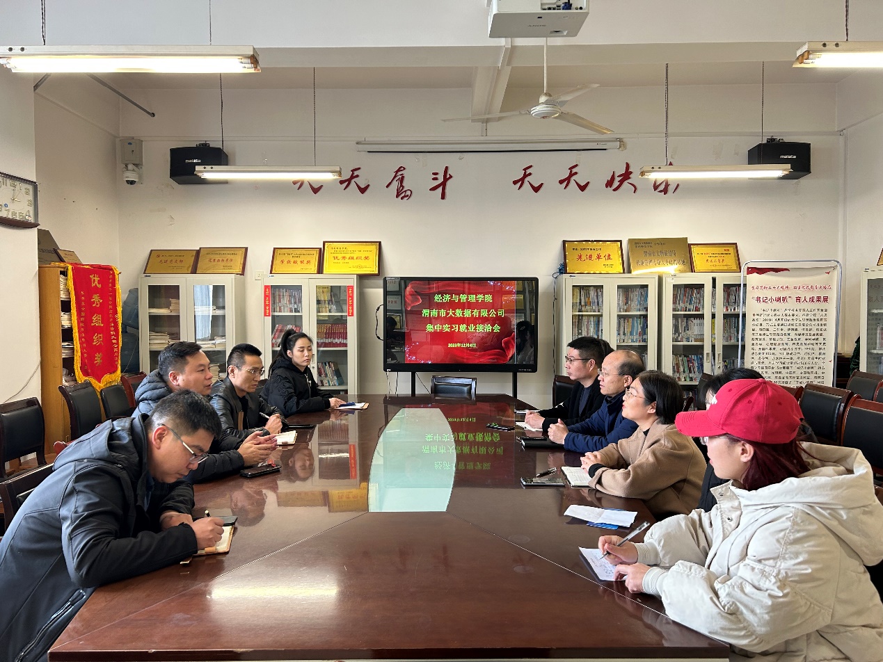 会上,卢红利详细介绍了渭南大数据有限公司的主要业务,包括渭南智慧城市板块与渭来生活圈电商板块等,并对未来校企合作的方向进行展望。李富荣从专业设置、员工人数、团队情况等方面详细介绍经管院的情况,并希望与渭南本地的优秀企业进行融合发展,加强校企深度合作,推进相关专业见习、实训和实习,促进就业并服务地方经济发展。谢稷光分析了当前毕业生的多元化就业心理,他希望能够通过实习打开校企合作的窗口,进一步深化合作。石党英详细介绍了目前大四员工的实习情况。随后,双方就未来校企合作的方向和落地形式做了详细讨论。