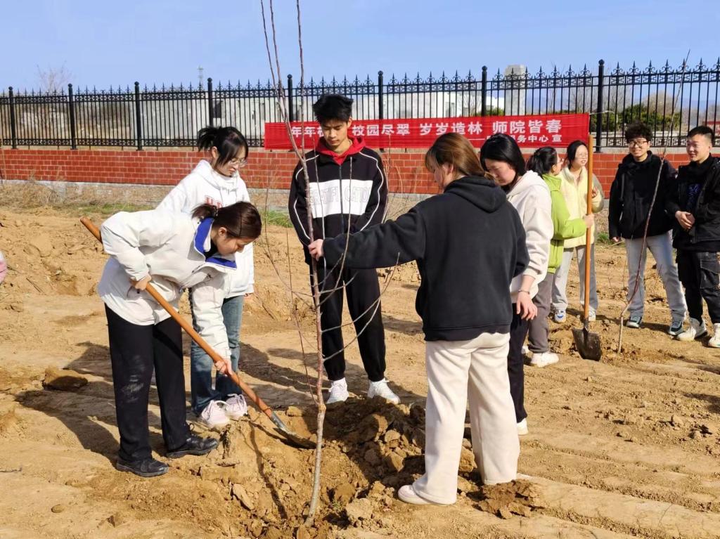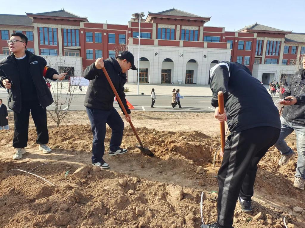 随着动员讲话结束,师生们分成小组,积极投入到植树工作中。接着,参与植树的师生分工协作,大家挖坑、栽苗、扶正、培土、浇水,各道工序有条不紊,一株株树苗稳稳在土里扎下根。