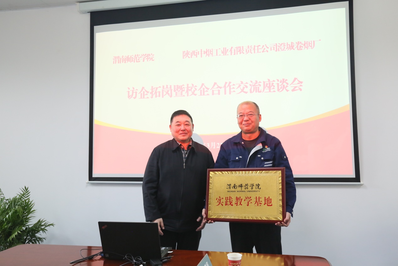 座谈会上,汪勇介绍了公司的基本情况和此次访企拓岗的目的。卢爱刚强调,通过加强课题申报、开展培训、加强实践教学等活动,推进双方的融合发展。随后,卓宇授予陕西中烟澄城卷烟厂“best365官方网站实践教学基地”牌匾。