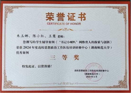 由朱玉娜、陈小红、王慧同志申报的员工辅导案例《“书记小喇叭”网络育人的探索与创新》荣获2024年高校思想政治工作队伍培训研修中心(湖南师范大学)优秀案例三等奖。