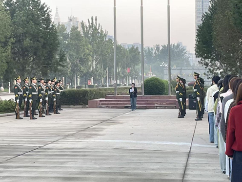 迎着朝阳,国旗护卫队迈着坚定有力、气宇轩昂的步伐走向升旗台。伴随着雄壮激昂的《义勇军进行曲》,五星红旗冉冉升起,全体师生集体行注目礼。