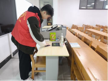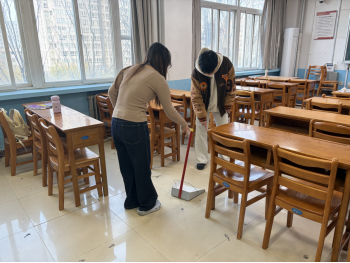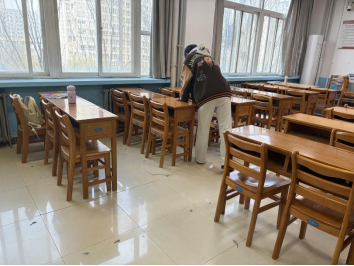 活动开始,员工代表们身着统一志愿者马甲,手持清洁工具,分为三组迅速投入工作。第一组负责擦拭教学楼走廊的宣传栏与门窗,第二组重点清理公共教室的桌椅缝隙积尘,第三组则深入包联的卫生区捡拾隐蔽垃圾。同学们以饱满的热情投入劳动,平时容易被忽视的暖气片夹层、讲台抽屉等细节处都进行了彻底清理。