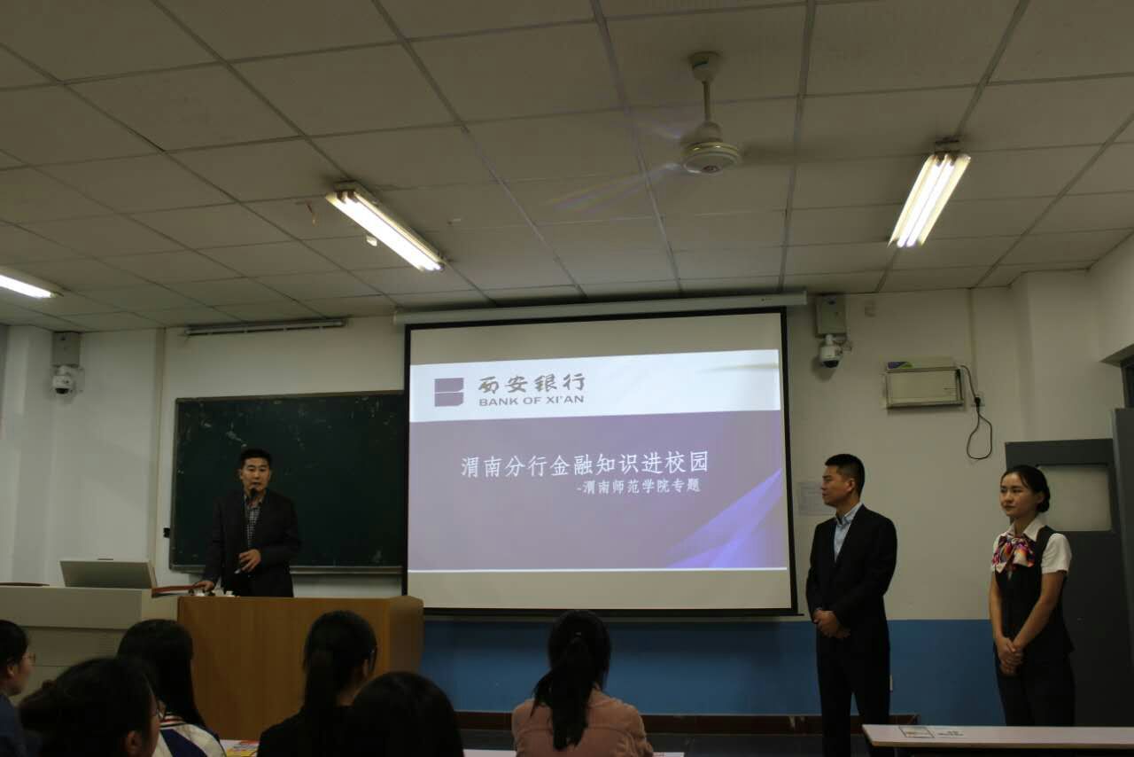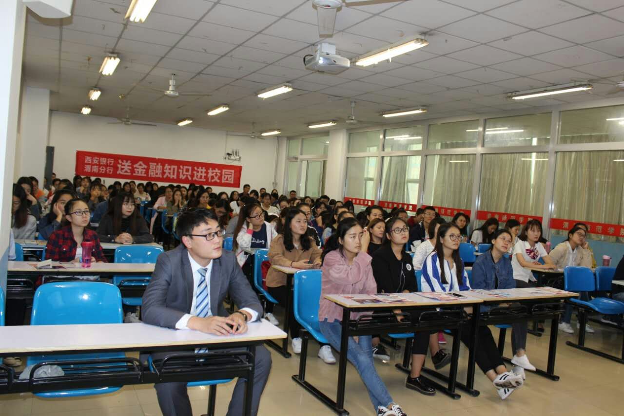 2017年9月27日下午2点,由东盟博仁财经公司与西安银行渭南分行前进路支行联合举办的“金融知识进校园活动”在博识楼1321教室举行。会议由公司党总支副书记景根杰主持。西安银行渭南分行前进路支行行长党文强、东盟博仁财经公司2014届电子商务毕业生、前进路支行营销部经理王敏及公司15、16级会计学和财务管理专业员工代表130余人参加了讲座。